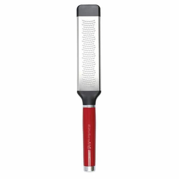 Crafted from premium grade materials, this KitchenAid Stainless Steel Two-Way Fine Cheese Grater in Empire Red is ideal for grating hard cheeses, chocolate, nutmeg and ginger as well as zesting lemons, limes and other citrus fruit. The extra sharp stainless steel blade features unique micro-serrations that grate in two directions for greater speed and efficiency. The addition of a silicone foot means this fine grater can be used in a number of ways – grating directly into a bowl, on a cutting board or onto any flat surface. The glossy ergonomic handle provides a sure grip and features a satin chrome-plated bolster and a debossed logo.