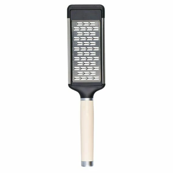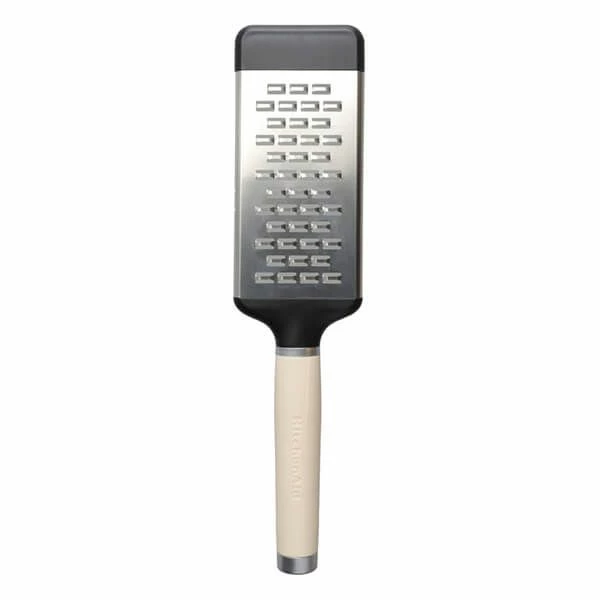 Crafted from premium grade materials, this KitchenAid Stainless Steel Two-Way Medium Cheese Grater in Almond Cream is ideal for grating hard cheeses, chocolate and a variety of vegetables. The extra sharp stainless steel blade features unique micro-serrations that grate in two directions for greater speed and efficiency. The addition of a silicone foot means this medium grater can be used in a number of ways – grating directly into a bowl, on a cutting board or onto any flat surface. The glossy ergonomic handle provides a sure grip and features a satin chrome-plated bolster and a debossed logo.