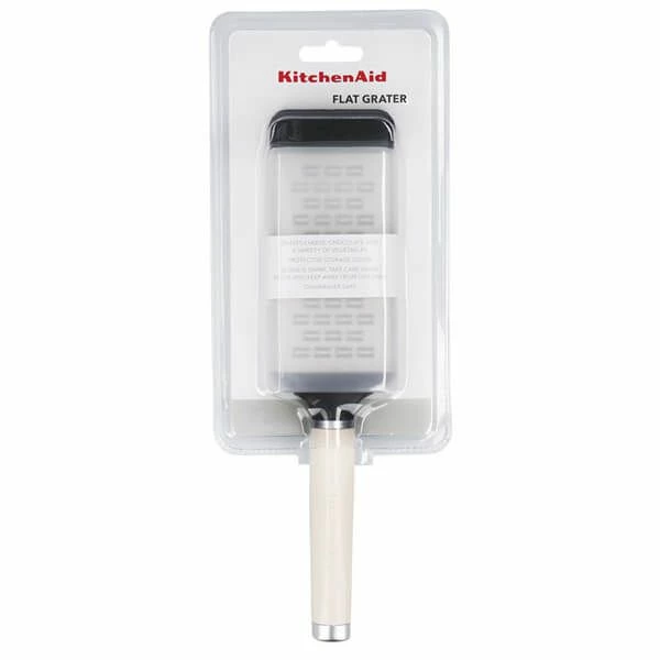 The KitchenAid Etched Stainless Steel Two-Way Medium Cheese Grater in Almond Cream is supplied with a protective blade cover for safe storage and a 1 year manufacturer’s warranty.