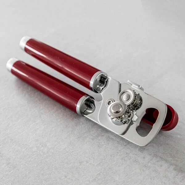 Crafted from premium grade materials, this KitchenAid Stainless Steel Can and Bottle Opener in Empire Red will make opening cans an easy task. The large, easy-to-turn knob rotates the sharp cutting wheel which is made from premium grade stainless steel. Glossy ergonomic handles provide a sure grip and feature satin chrome-plated bolsters and a satin chrome-plated badge.