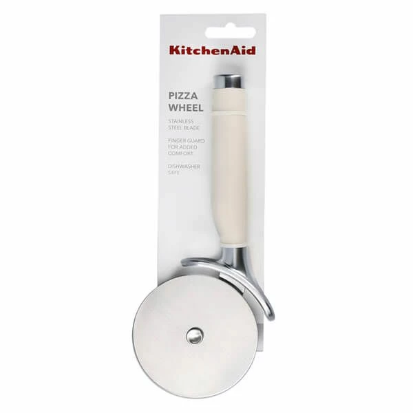 Crafted from premium grade materials, this KitchenAid Stainless Steel Pizza Wheel in Almond Cream will easily cut through pizza crusts and toppings. The sharp stainless steel rolling blade will cut pizzas into neat and tidy slices. The glossy handle incorporates a finger guard to protect hands and also features a debossed logo and a satin chrome-plated bolster.