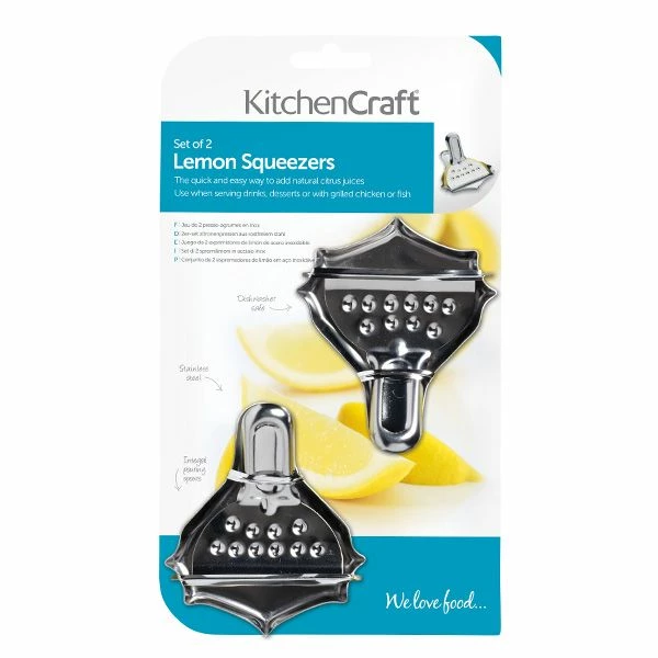 Set of two stainless steel squeezers with integral pouring spouts for quickly and easily adding natural citrus juices to drinks, desserts, and recipes.