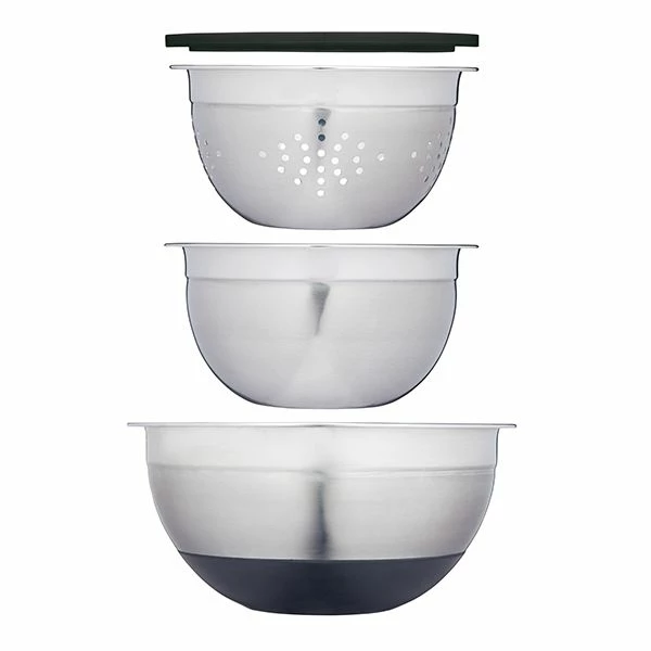 This space saving set from the MasterClass Smart Space range includes 1 x 23cm non-slip mixing bowl, 1 x 18cm colander and 1 x 18cm lidded bowl, allowing you to mix, rinse, drain and store. Ideal for preparing pasta and salads or rinsing fruit and vegetables. The smallest bowl features a seal tight lid that seals in freshness so you can keep leftovers fresh for longer. This entire set is fridge and freezer safe. All three bowls nest together so they take up the space of just the larger bowl, perfect for clutter free kitchen cupboards! 5 year guarantee.