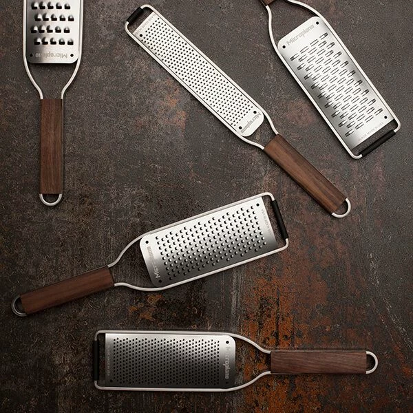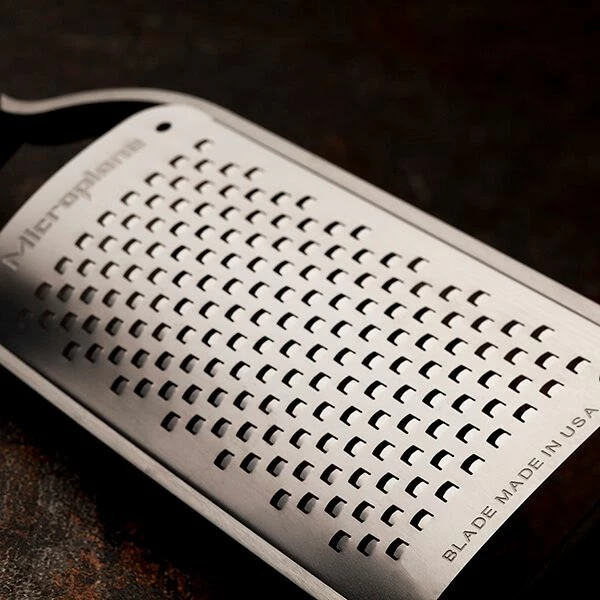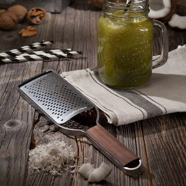 The Microplane Master Series Coarse Grater features an ultra sharp and long lasting stainless steel blade with a stunning wooden handle sourced from sustainable American Walnut that provides comfort and grip.