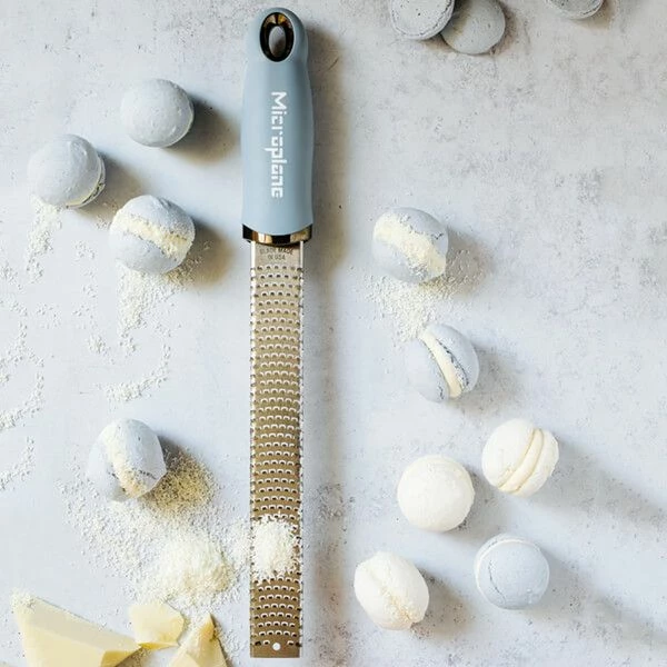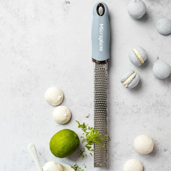 This Microplane Premium Classic Series Zester/Grater in Sky Blue has a photo-etched stainless steel blade for ultra sharp and long lasting performance when zesting citrus fruits.