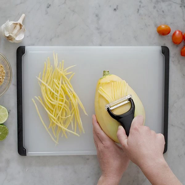 The OXO Good Grips Julienne Peeler ensures you can quickly and safely make garnishes, salad toppings, citrus zest and more. This peeler contains a clear safety cover that flips out of the way whilst your peel, but then locks back into place to act a a protective cover during storage. Dimensions: 15.2cm x 7.6cm x 2.5cm. Soft non-slip grip handle for easy use. Dishwasher safe.