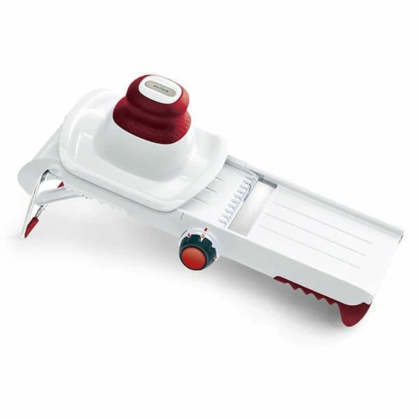 The Zyliss folding mandoline features high grade stainless steel blades for precise slicing and a dial that can quickly and easily change between 5 different slicing thicknesses and julienne cuts.